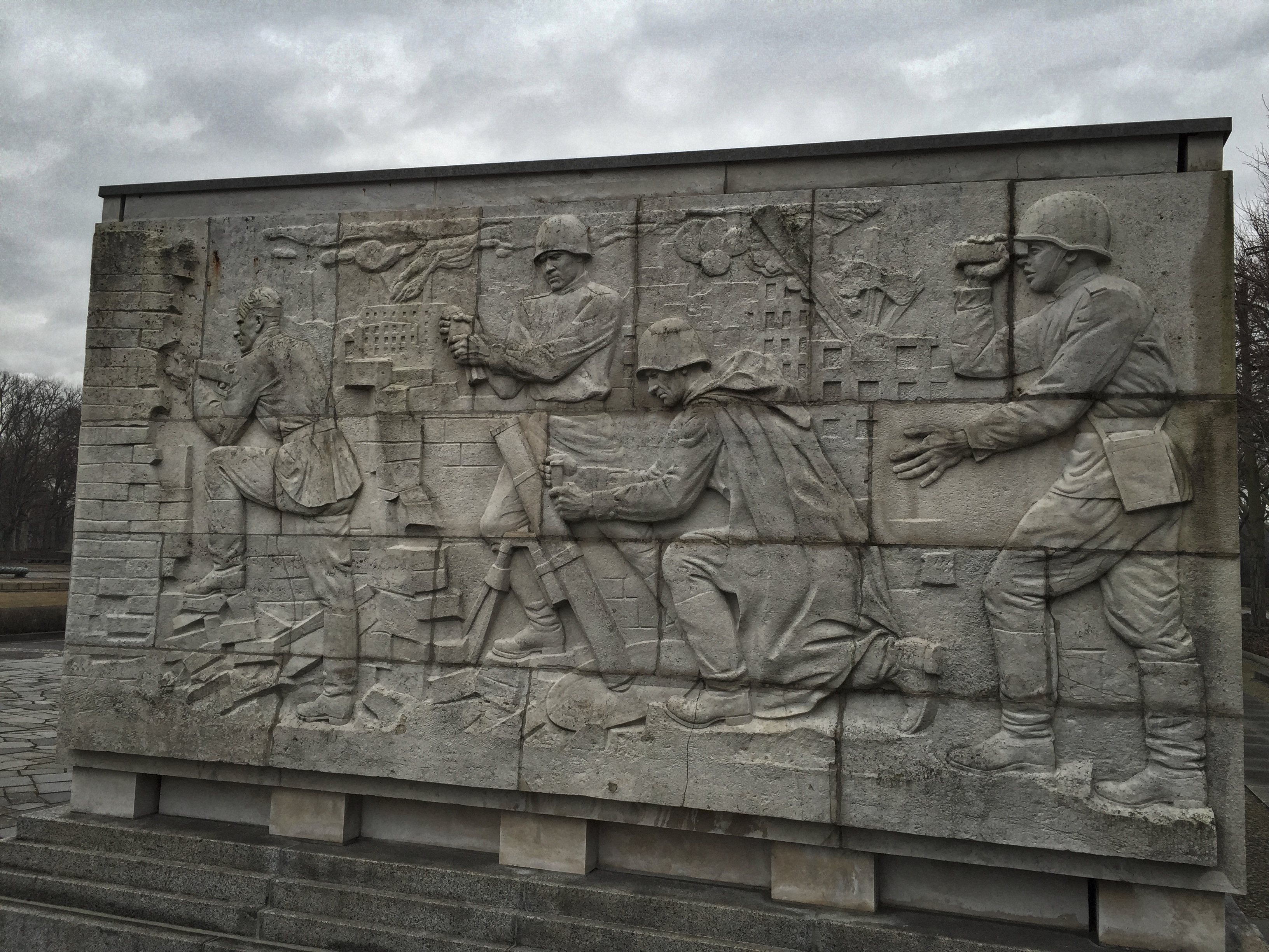 The site commemorates more than 80,000 Soviet soldiers who died in the final battles in April-May 1945, with many of them being buried here. A massive statue of a Soviet soldier holding a child in one hand and a sword in the other held at rest, having cut a Swastika in half, dominates the site.