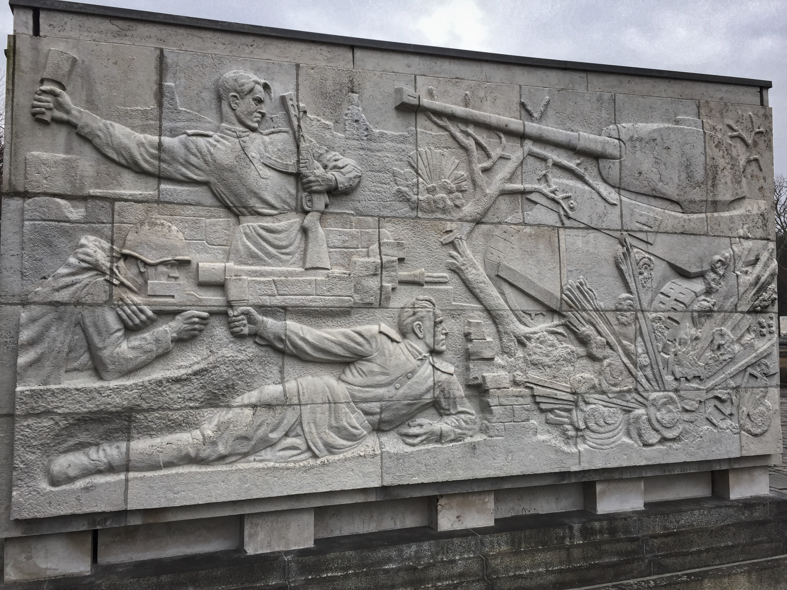 In addition a whole series of murals depict aspects of the Soviet experience of war from Operation Barbarossa in 1941 to the advance into Berlin in 1945. They show a very ‘rosy’ view of the war, with Soviet citizens rising up, Partisans fighting back, troops defeating the fascists and Russians being welcomed by Germans as they came into Berlin in the final phase of the war. This type of physical propaganda was perhaps persuasive after the war to some, especially as this area of Berlin was part of the DDR, but it presents an image of the war that many would not recognise now. And that is what it makes it fascinating and turns the memorial into an historical document in its own right, making it very much part of our collective historiography of the Second World War.