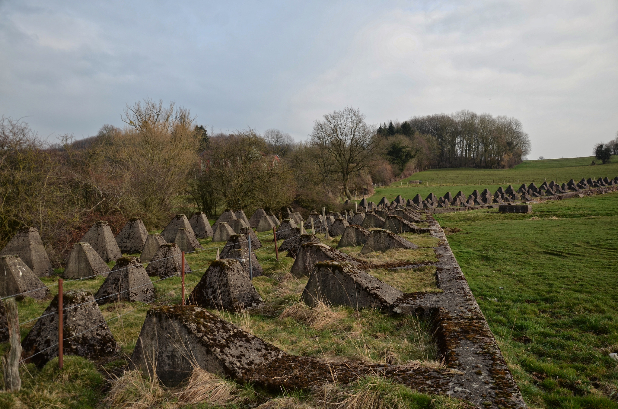 I visited the area of the Siegfried Line near Aachen last week and had a look at the remaining belts of Dragon’s Teeth. Some of these still stretched for miles and were very impressive. Around the villages of Walheim and Schmithof are numerous remains of the Siegfried Line, and it was also an area quite heavily photographed at the time too. One interesting discovery was that very few of the bunkers which protected the line were still visible. Some had been destroyed in the fighting, or post-war by explosives, but many had been deliberately buried.