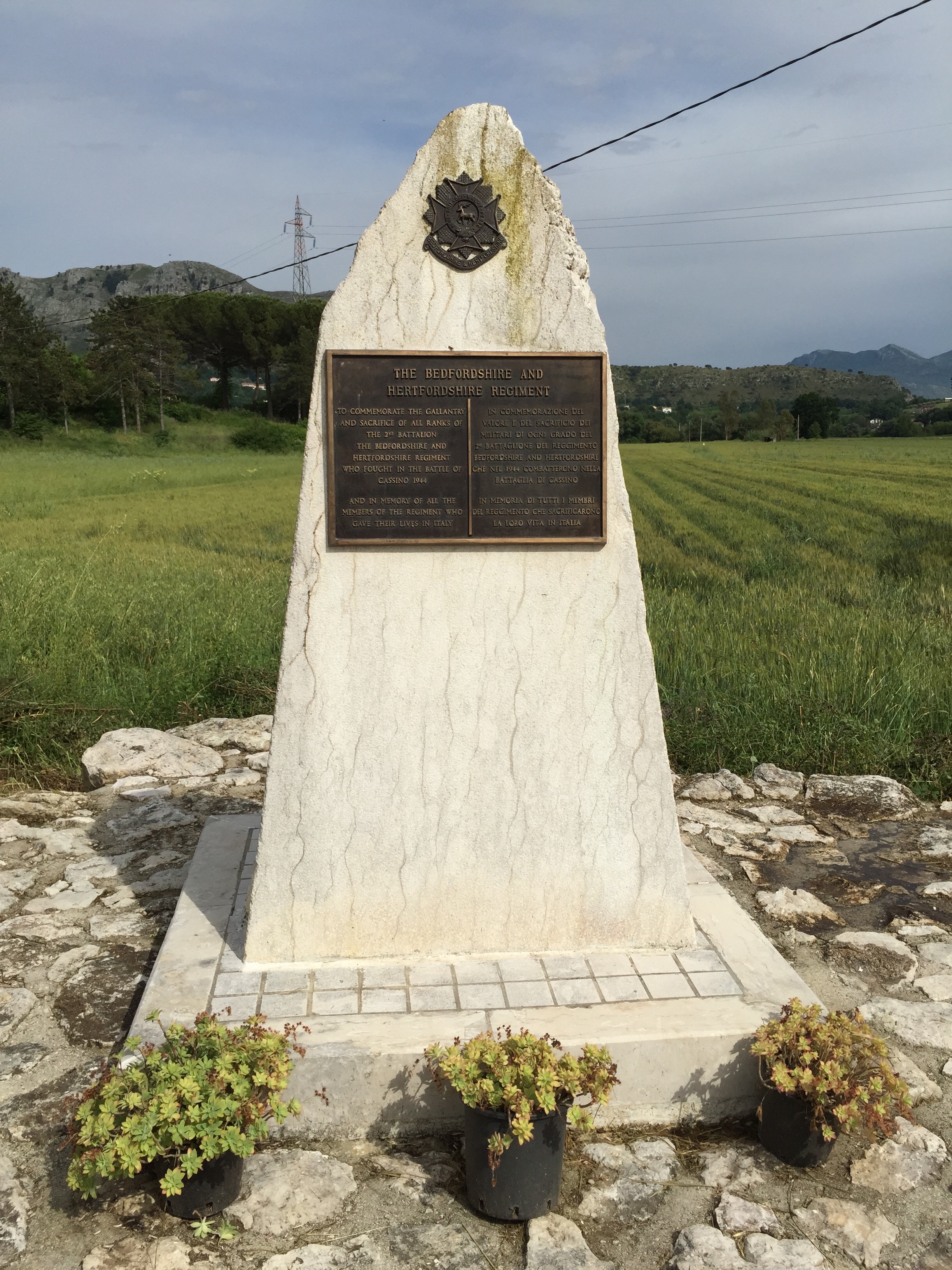 The Bedfordshire & Hertfordshire Regiment was a Territorial Army unit and it’s 2nd Battalion served with the 4th Division in the Italian Campaign. This memorial commemorates their role in the Fourth Battle of Monte Cassino in May 1944 when the battalion crossed the Gari river during the advance into the Liri Valley. It overlooks the site of the famous Amazon Bridge, built by the Royal Engineers to allow troops to cross the river.