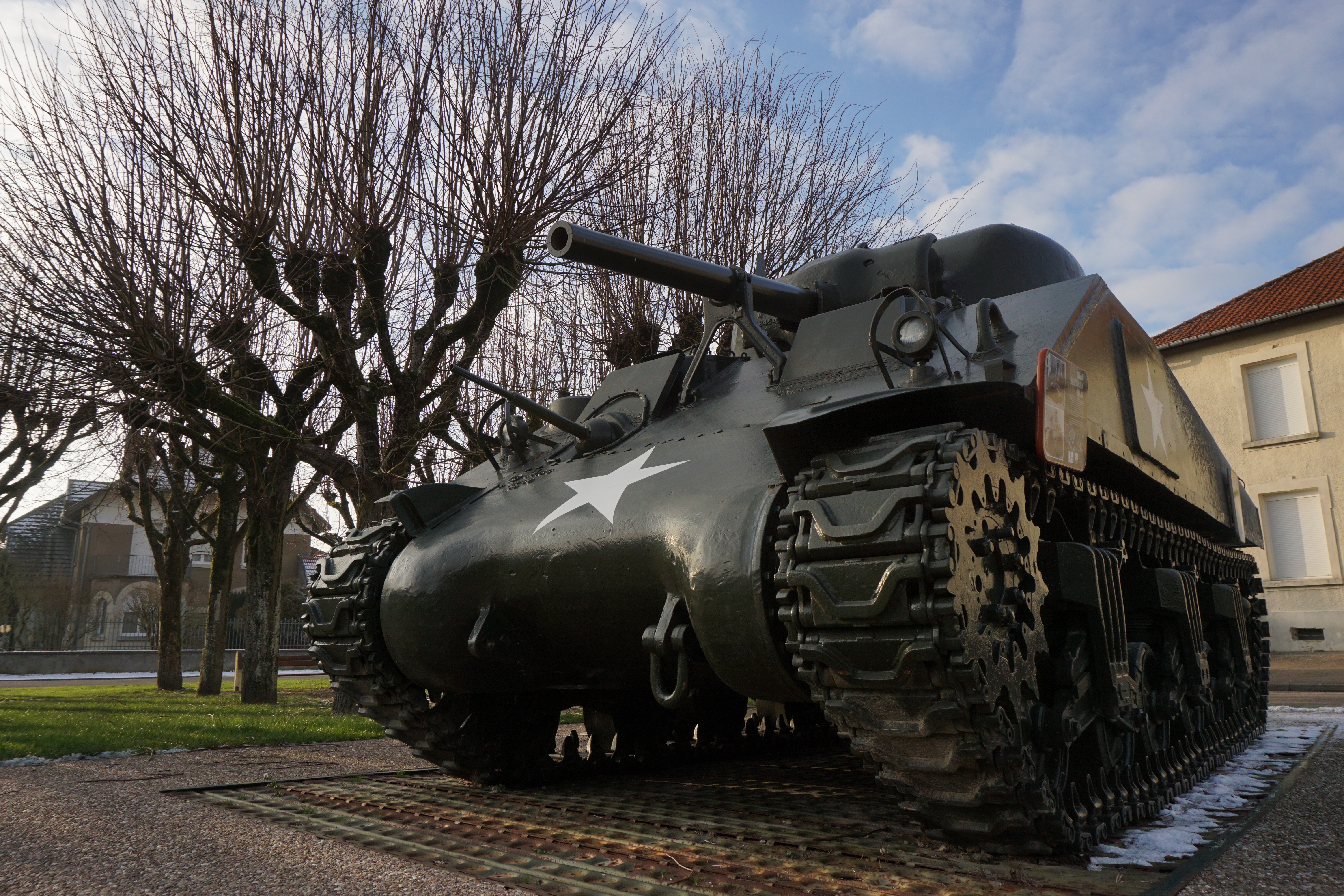 This M4 Sherman appears to be an M4A4 model used by US troops in the last phase of WW2 and also by Free French and post-war French Army. The tank comes from the French Tank Museum at Saumur and was put here to commemorate the liberation of the region in 1944.